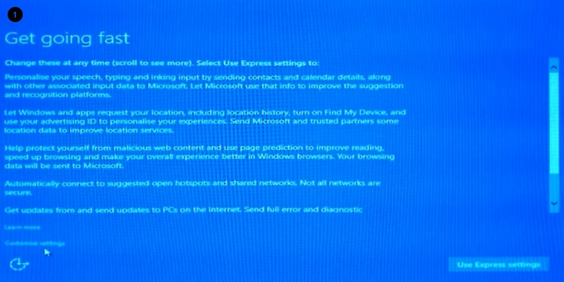 - After an automatic restart or two, you will be presented with the Get going fast screen. I like to customize my settings so that I can turn on/off features to my liking. If you’re not fussed, click on the Use Express settings button.