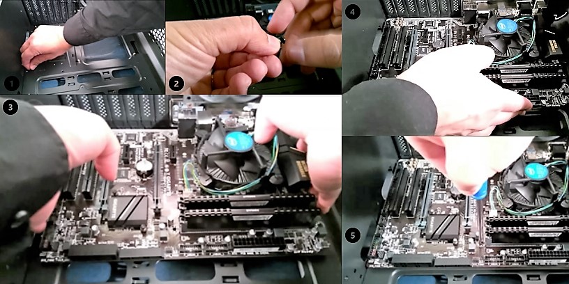 - The heatsink has four spring loaded screws that are inserted into the motherboard’s four holes by pushing down and locking the screws in the direction shown on the screws themselves.