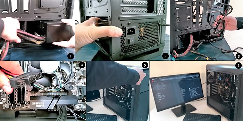- In my case the PSU is separated off from the motherboard and tidying up the cables is a lot easier. For the moment though we just want to test that the main components (CPU, motherboard and memory) power up and work correctly, so don’t worry about the cabling mess.
