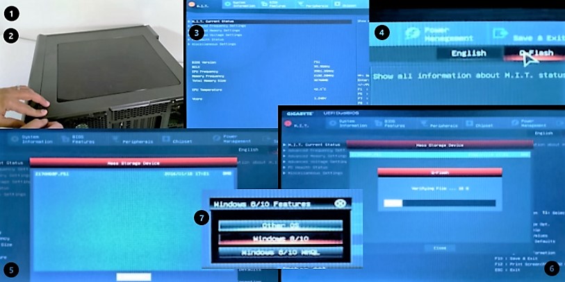 - My Gigabyte motherboard has a Q-Flash utility to do this. I downloaded the latest BIOS from the manufacturer’s site, copied the unzipped file to a fat32 formatted USB drive and plugged it into the PC.